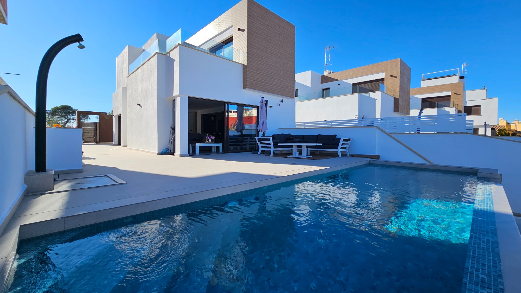 Just a stone's throw from the exclusive La Finca Golf , we present this exceptionally spacious and modern villa, where comfort, luxury and quality of life effortlessly come together. With a living area of over 200 m², spread over three full floors, this property offers ample space for both permanent living and carefree holidays under the Spanish sun. Truly, everything has been thought of here. The villa features a heated infinity pool that blends seamlessly into the landscape, inviting you to relax in any season. Inside, you'll find an integral garage, a fully equipped home theater, and a second kitchen in the basement&mdash;ideal for guests, extended stays, or creating a self-contained apartment. From the first floor, you'll enjoy breathtaking views, while the warm, high-quality finishes throughout the house instantly create a sense of luxury and home. No expense has been spared in the design and finishing touches; every detail is perfect. Parking is convenient on-site or in the indoor garage. And with the coast just 16 kilometers away – about a 20-minute drive – you can combine the best of both worlds: peace, space, and nature, with the sea always within easy reach. Are you looking for a complete villa in a prime location, suitable for permanent residence and as an exclusive holiday home? Please contact us for more photos and detailed information, or schedule a viewing today. Your new home in the sun awaits.